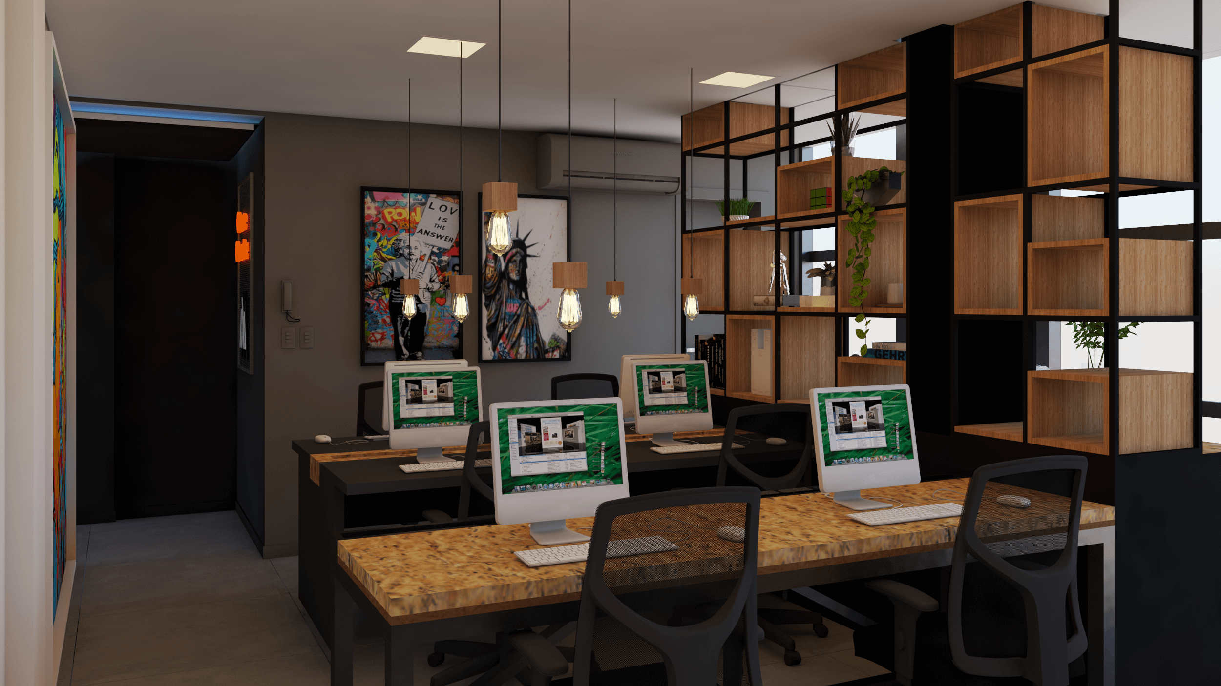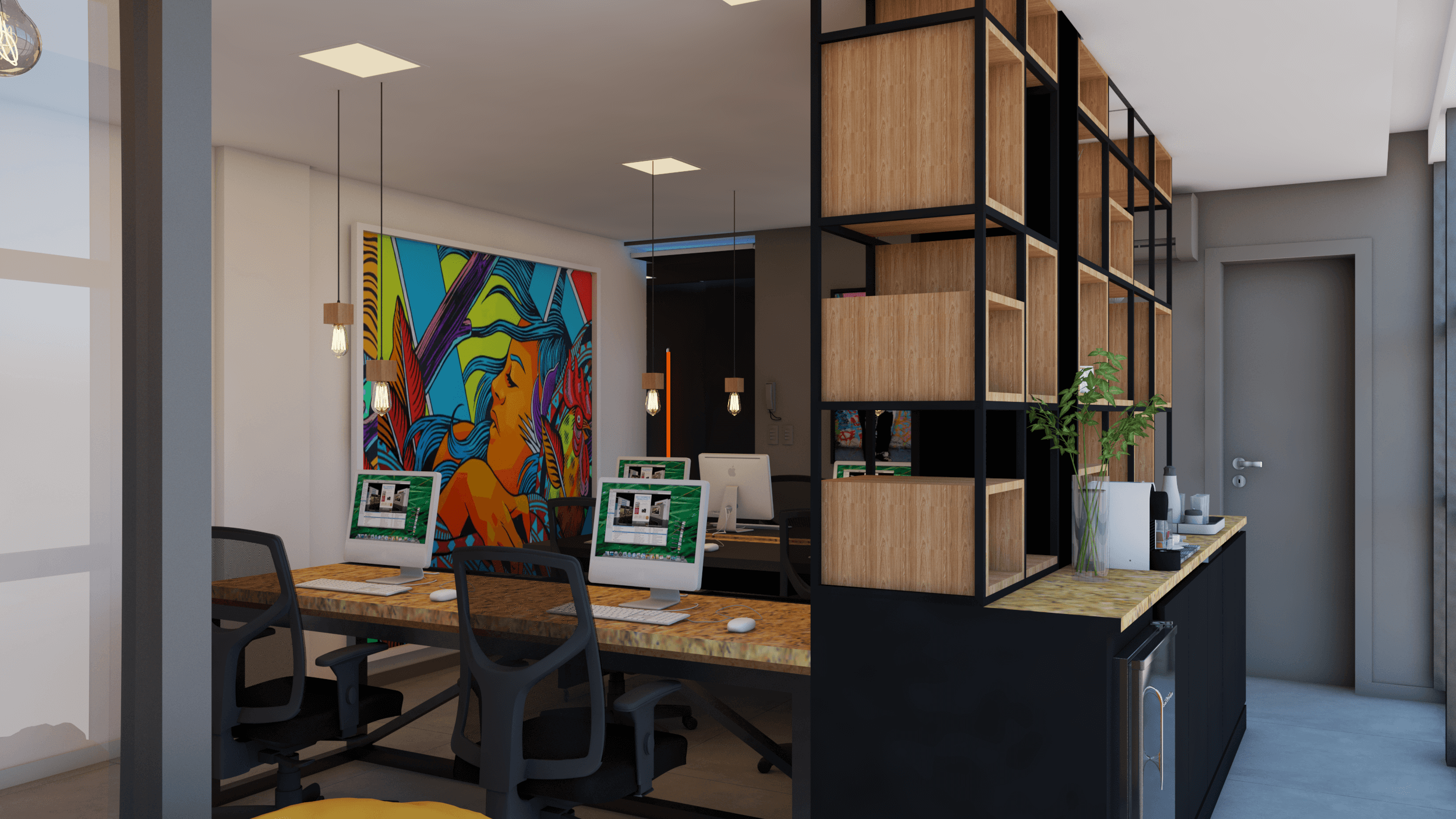 Realizado em parceria com a Arquiteta Ana Carolina Faria Alves o desafio enfrentado nesse projeto foi conceber um ambiente que harmonizasse o estilo industrial e o conceito da empresa com uma sensação de leveza, priorizando a ergonomia e a otimização eficaz dos espaços de trabalho.