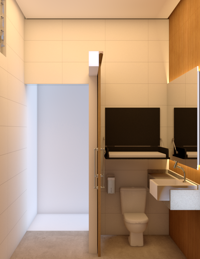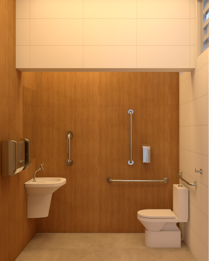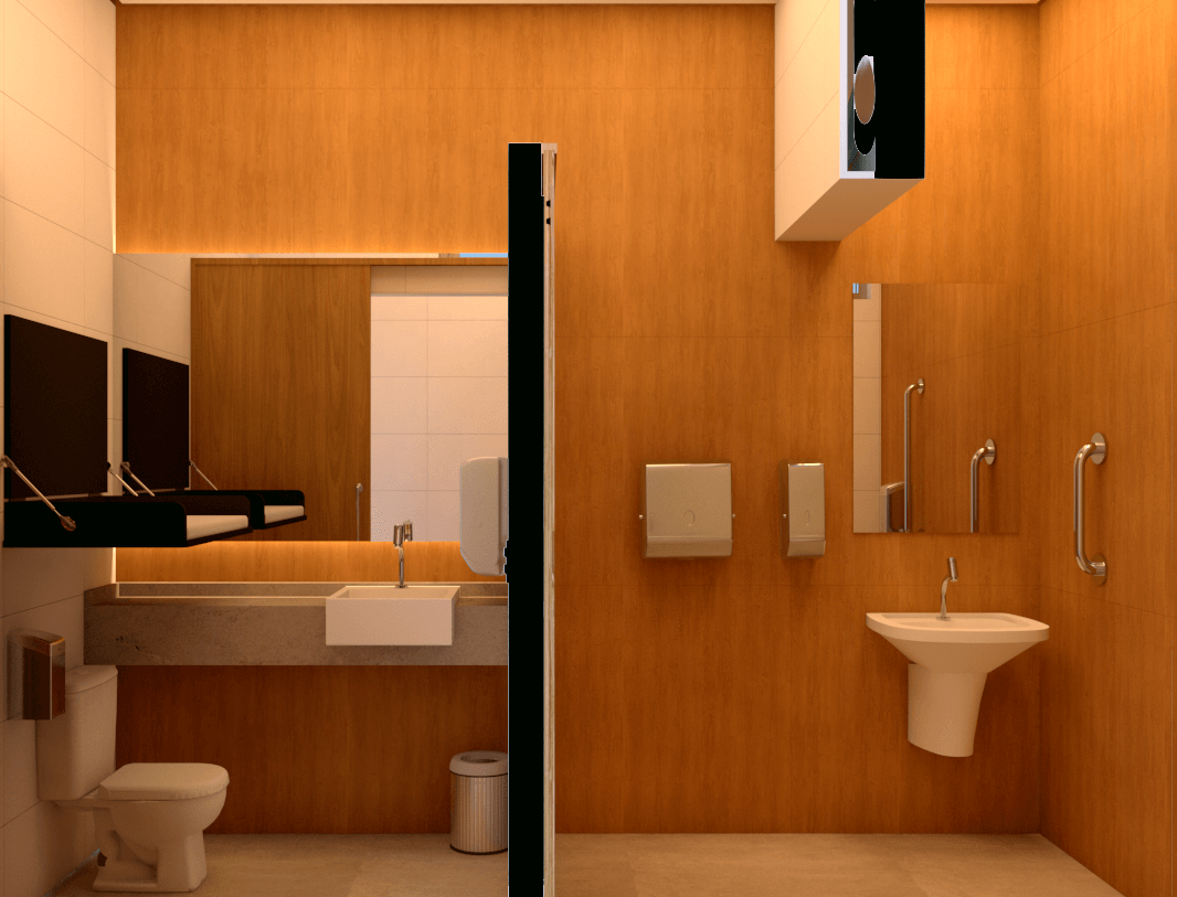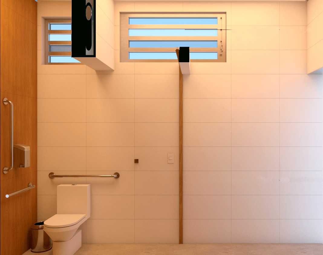No projeto de reforma deste banheiro adicionamos um banheiro PCD (Pessoas com Deficiência) que segue estritamente as normas de acessibilidade, criando um ambiente inclusivo e funcional para todos os usuários.